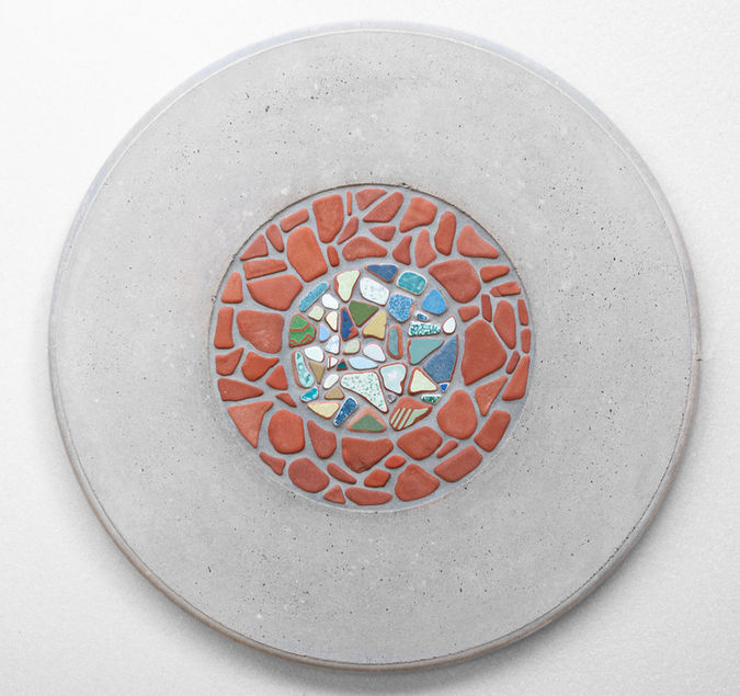 Bei Familienferien an der ligurischen Küste sind mir bereits vor Jahren die angeschwemmten farbigen Keramikteile aufgefallen. Nach einigem Tüfteln mit Beton entstand die ideale Form. Es sind Betonplatten, in die ich die einzigartigen rundgeschliffenen, bunten und terracottafarbenen Teile zu verspielten Mosaiken gelegt habe. In meiner Werkstatt stehen jetzt bereits über vierzig Tischplatten zur Auswahl.